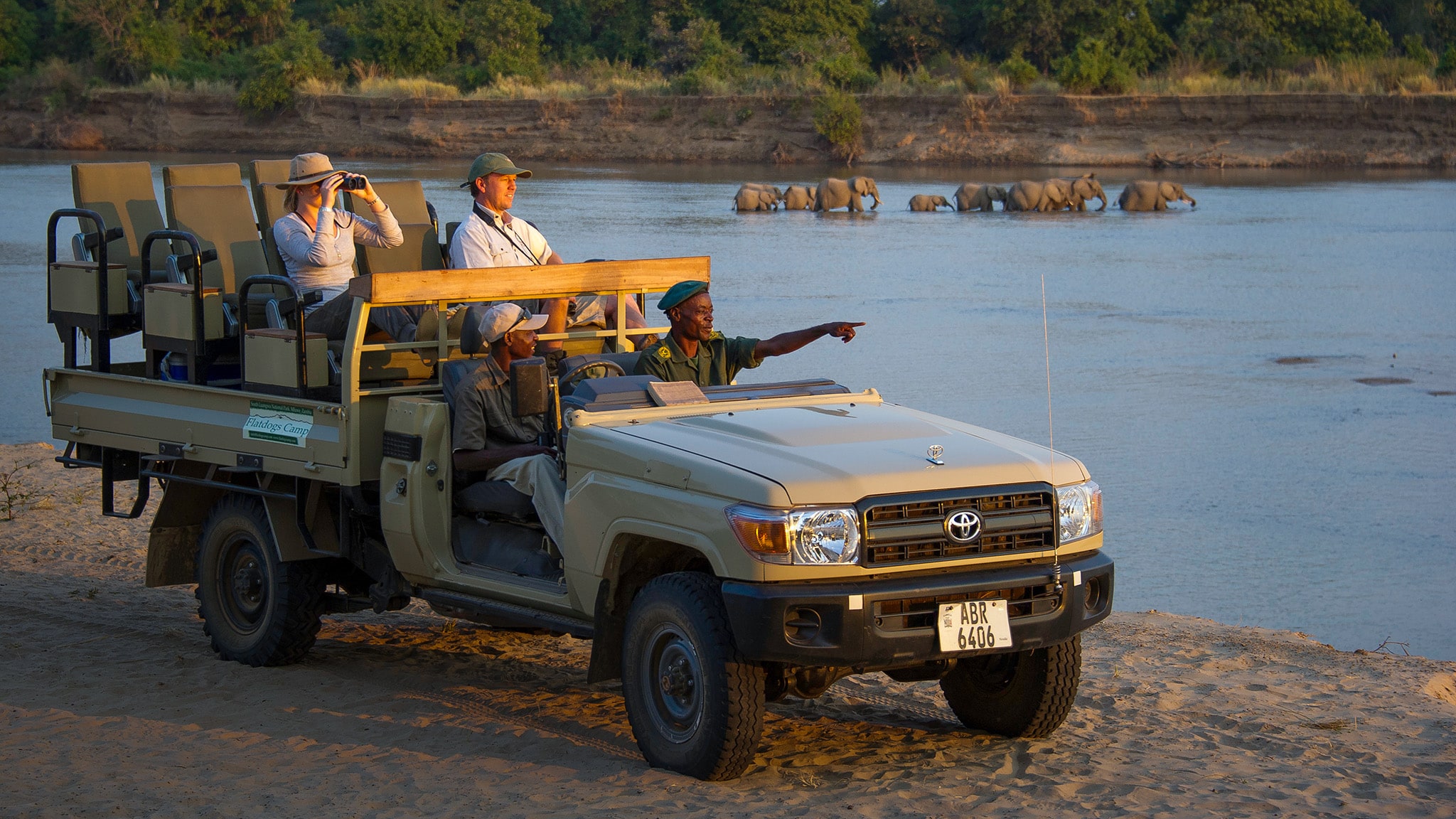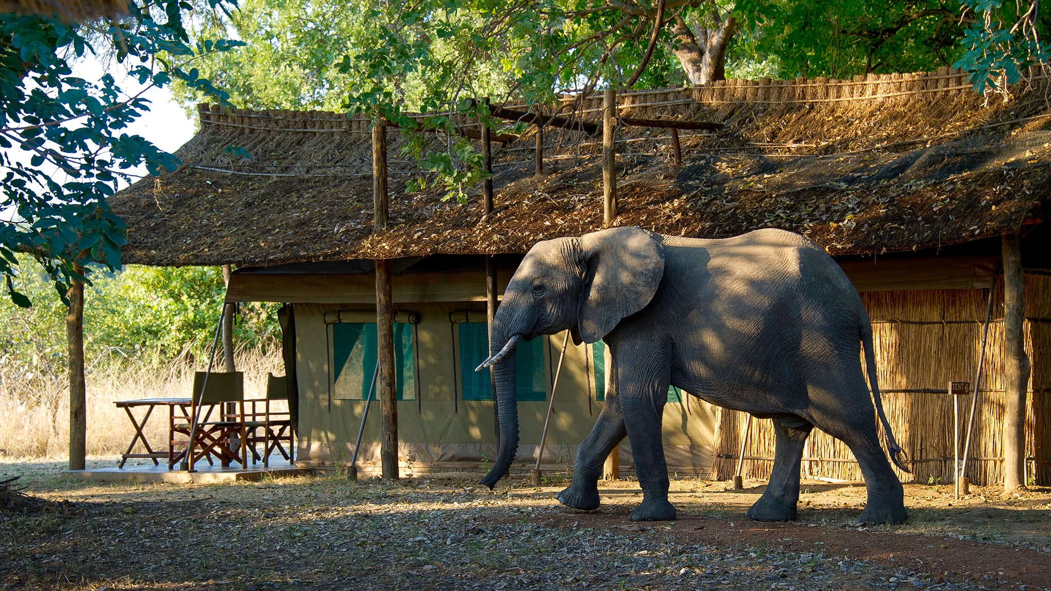 Stay at Flatdogs Camp on the Luangwa River's banks, where elephants wander through camp and wildlife viewing continues between drives.